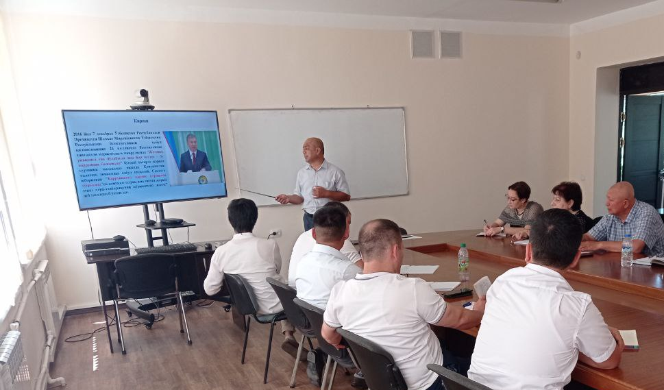 Toshkent shahar Uy-joy kommunal xizmat ko‘rsatish bosh boshqarmasi bosh huquqshunosi, 2-darajali adliya maslahatchisi T.R.Tuxtasinov tinglovchilarga “Korrupsiyaga qarshi kurashish barchamizning burchimiz” mavzusida bo‘lib o‘tgan o‘quv seminar mashg‘ulotidan foto lavxalar