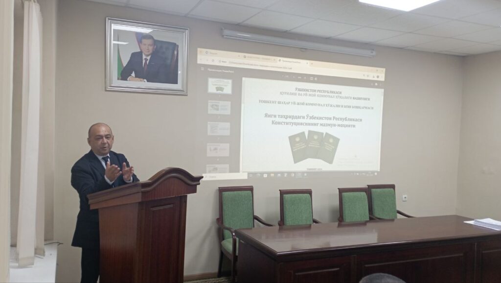 O‘zbekiston Respublikasi Prezidentining 2024-yil 17-oktyabrdagi “O‘zbekiston Respublikasi Konstitutsiyasi kuni bayramiga tayyorgarlik ko‘rish va uni o‘tkazish to‘g‘risida”gi F-53-son Farmoyishidagi topshiriqlar ijrosini ta’minlash yuzasidan 2024-yil 23-oktyabrda Qurilish va uy-joy kommunal xo‘jaligi vazirining 01/2-23/128-son taqdim etilgan “NAZORAT REJASI” ijrosini ta’minlash yuzasidan Toshkent shahar Uy-joy kommunal xo‘jaligi bosh boshqarmasi bo‘lib o‘tgan targ‘ibot tushuntirish tadbiridan lavxalar
