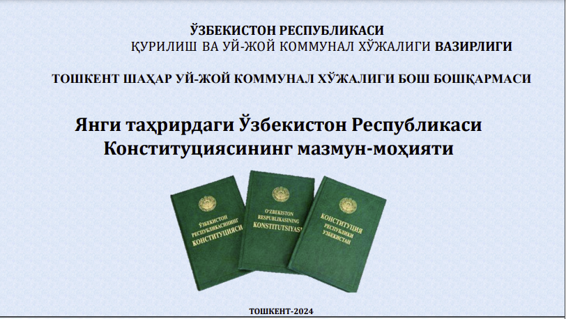 O‘zbekiston Respublikasi Prezidentining 2024-yil 17-oktyabrdagi “O‘zbekiston Respublikasi Konstitutsiyasi kuni bayramiga tayyorgarlik ko‘rish va uni o‘tkazish to‘g‘risida”gi F-53-son Farmoyishidagi topshiriqlar ijrosini ta’minlash yuzasidan 2024-yil 23-oktyabrda Qurilish va uy-joy kommunal xo‘jaligi vazirining 01/2-23/128-son taqdim etilgan “NAZORAT REJASI” ijrosini ta’minlash yuzasidan Toshkent shahar Uy-joy kommunal xo‘jaligi bosh boshqarmasi bo‘lib o‘tgan targ‘ibot tushuntirish tadbiridan lavxalar