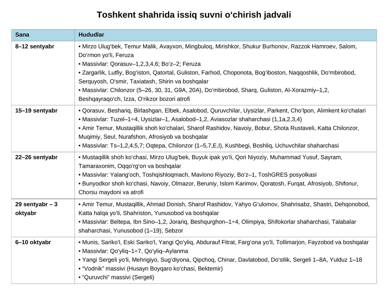 Kuz-qish mavsumiga tayyorgarlik doirasida profilaktika-ta’mirlash ishlari olib borilayotganligi sababli Toshkent shahar hududlarida issiq suv ta’minoti jadval asosida vaqtincha to‘xtatiladi.