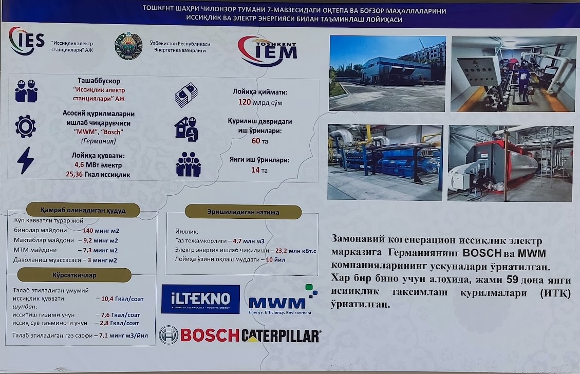 Toshkent shahar Uy-joy kommunal xo‘jaligi bosh boshqarmasi boshlig‘ining birinchi o‘rinbosari Bekzod Talatov va Bosh boshqarmaning tegishli bo‘lim xodimlari Chilonzor tumanidagi “Oqtepa” va “Bog‘zor” mahallalari hududida ishga tushirilgan kogeneratsiya qurilmasini ko‘zdan kechirishdi.